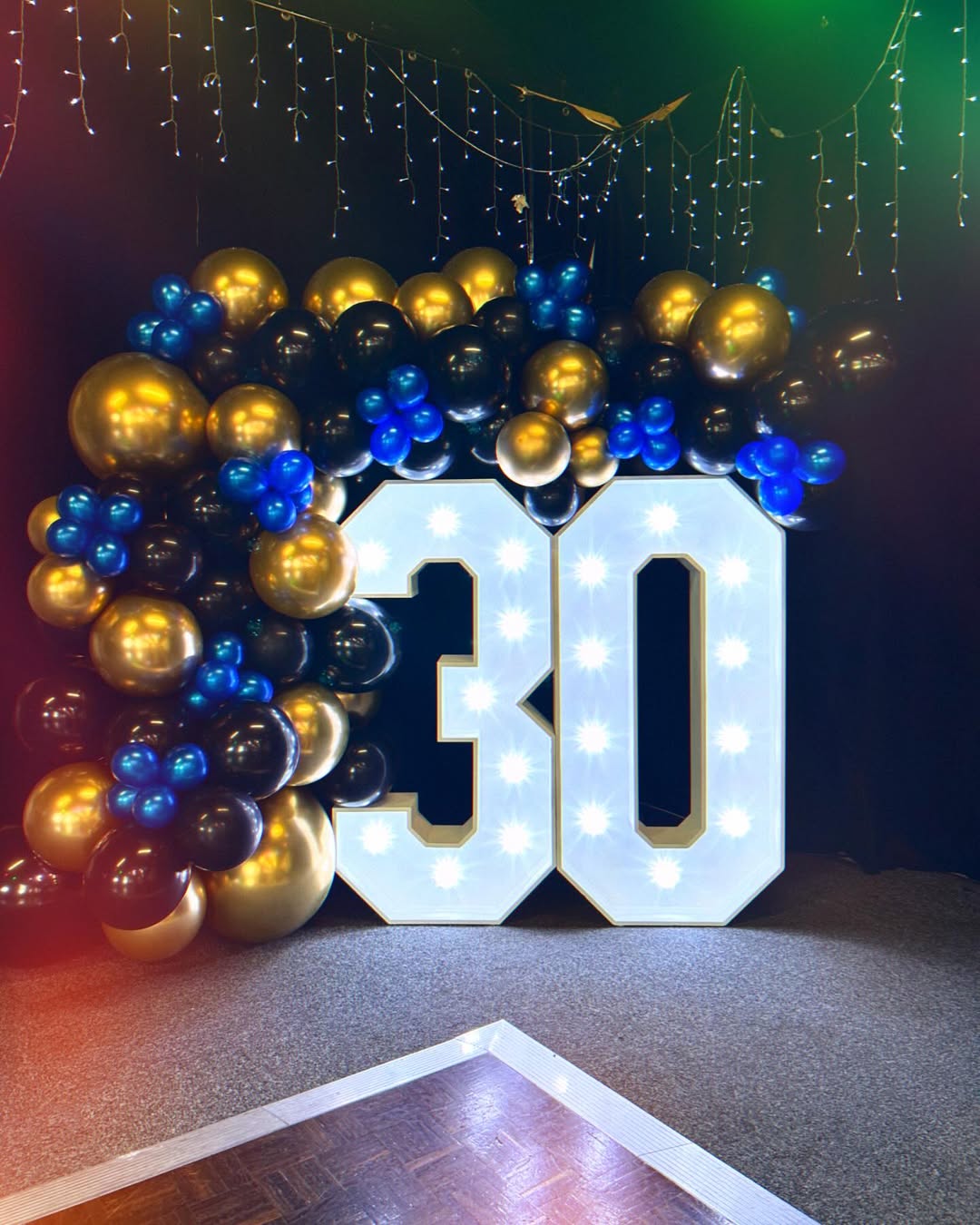 This professional installation features our signature 4ft tall white wooden marquee numbers, fitted with warm white LED bulbs for a classic glow. To elevate the look, the numbers are framed by a bespoke organic balloon garland in a sophisticated palette of matte black, chrome gold, and vibrant electric blue. This setup is freestanding and PAT tested, making it an ideal “wow” factor for venue dance floors or as a primary photo backdrop.
