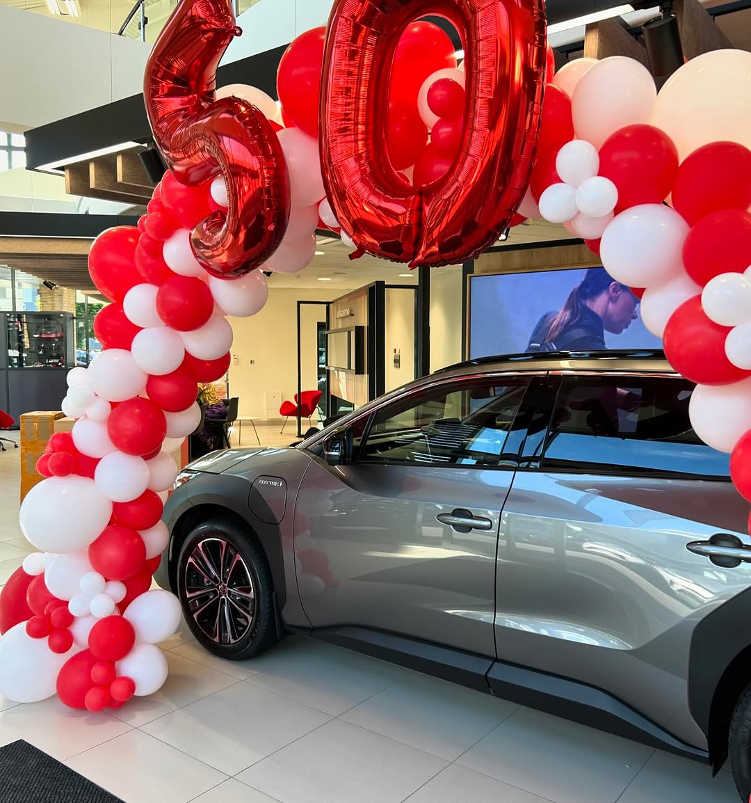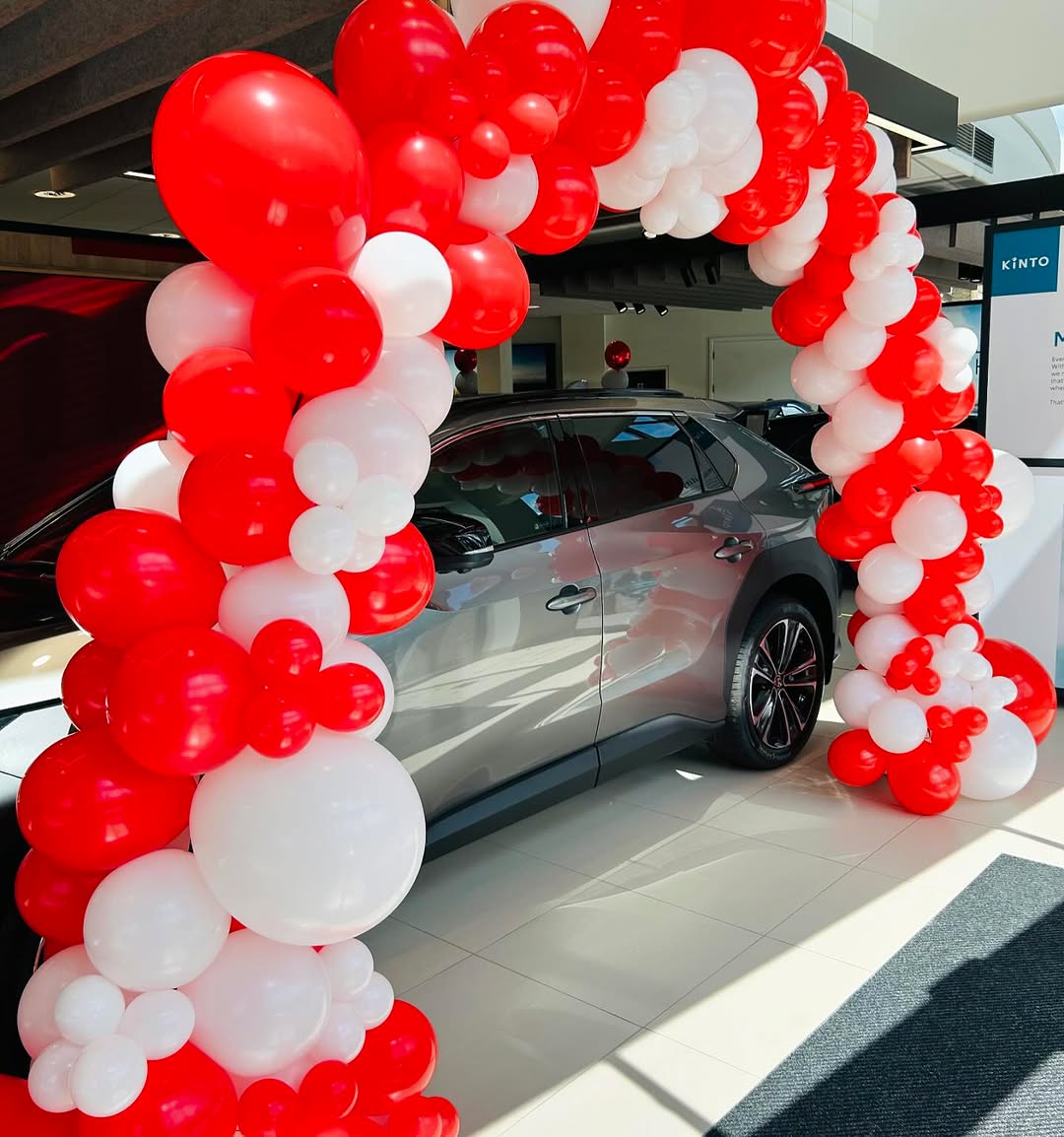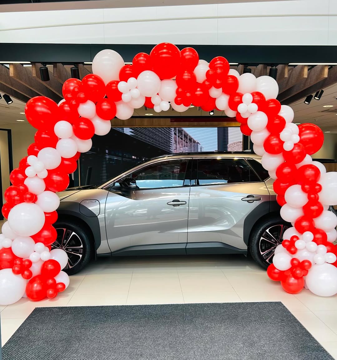 Designed specifically for commercial spaces, showrooms, and grand openings, this bespoke balloon arch is the ultimate tool for drawing customer attention. Unlike standard spiral arches, this display uses a modern “organic” technique with varying balloon sizes (from 5-inch accents to large 24-inch features) to create a thick, luxurious texture. It creates a perfect frame for vehicles, store entrances, or promotional displays. The colors are fully customizable to match your company branding or sports team colors.