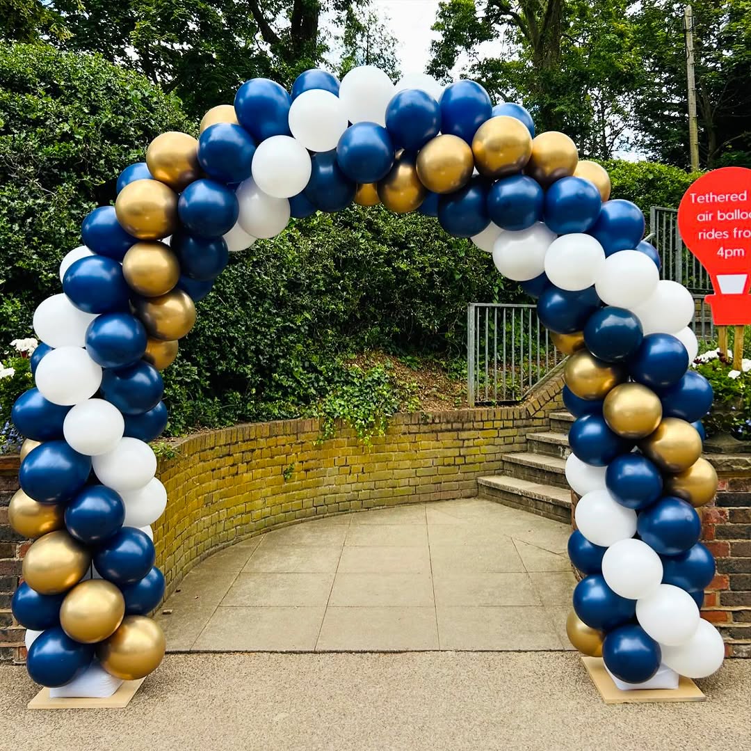 This eye-catching entrance piece features a thick, professional-grade spiral design using a full spectrum of vibrant colors, including royal blue, sunny yellow, royal purple, hot pink, lime green, and bright orange. The arch is built on a sturdy, weather-resistant frame with weighted bases to ensure stability for outdoor use at school fairs, shop grand openings, or garden parties. Small white balloon clusters are added throughout to give a “cloud” effect, making it a perfect photo opportunity for guests as they arrive.