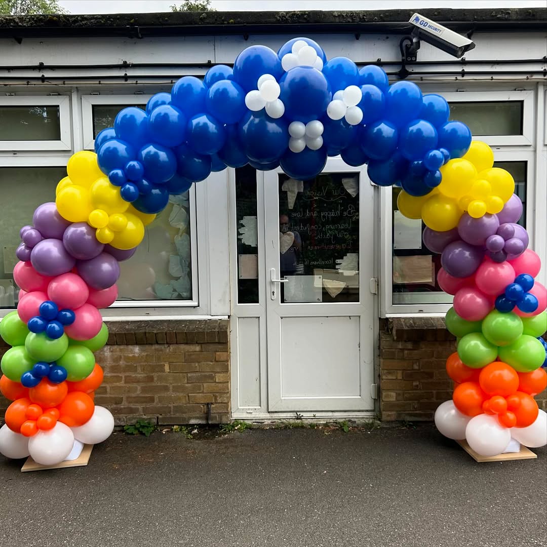 A bright and bold multi-colored balloon arch designed to create a grand, joyful entrance for any outdoor or indoor event.